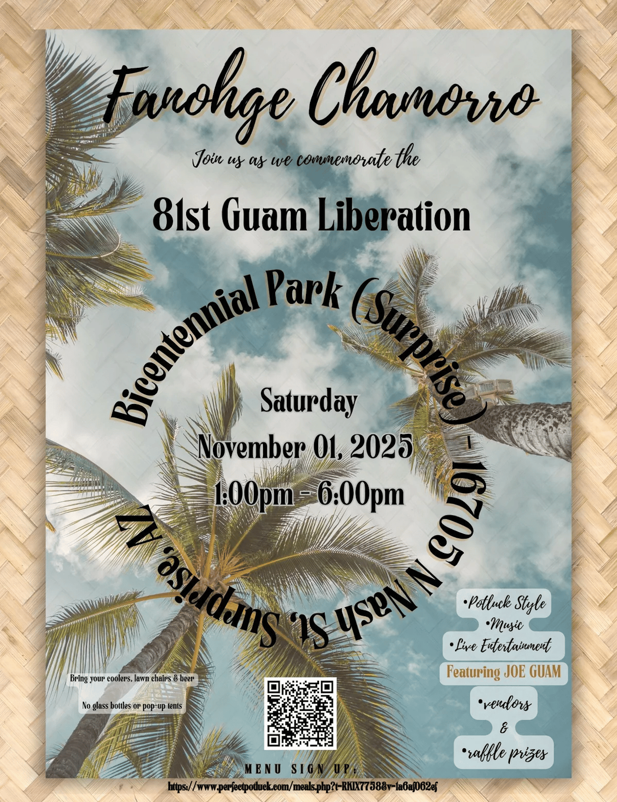 Fanohge Chamorro Presents: Arizona’s West Valley Liberation Celebration will take place 1-6 pm at Bicentennial Park, 16705 N Nash St. in Surprise, Arizona - a suburb of metropolitan Phoenix. There will be vendors, raffle prizes and live entertainment including a performance by Joe Guam. Bring your lawn chairs, picnic tables and beer - cans only, no glass bottles or pop-up tents. Click here to for potluck details.