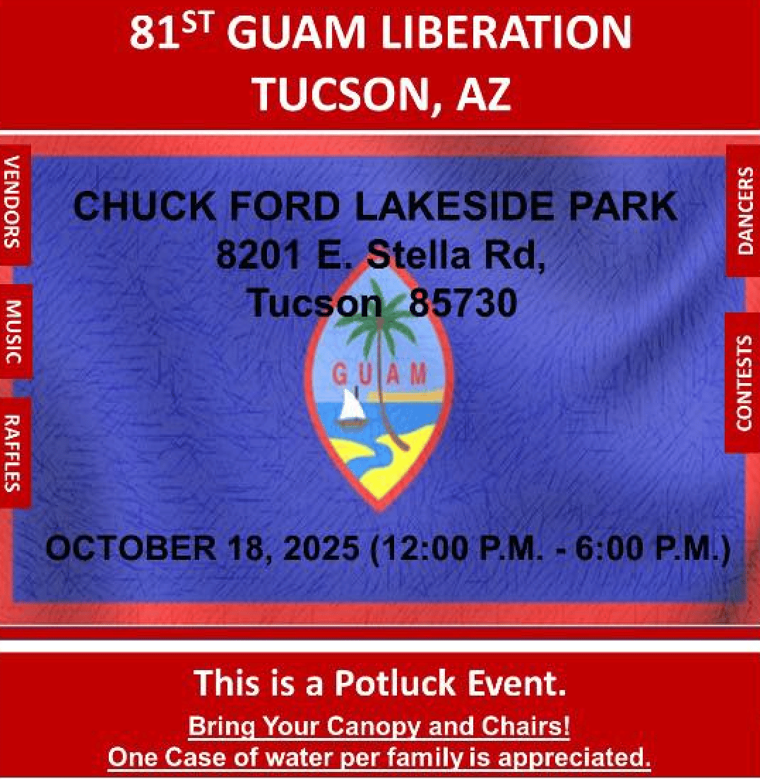 Tucson area residents will be celebrating the 81st Guam Liberation at Chuck Ford Lakeside Park in Tucson from 12-6 pm. Attendees are asked to bring a potluck dish and one case of water per family, as well as a canopy and chairs for your family. Contact organizers to let them know what you’ll be bringing - contact numbers are on the public Facebook group.
