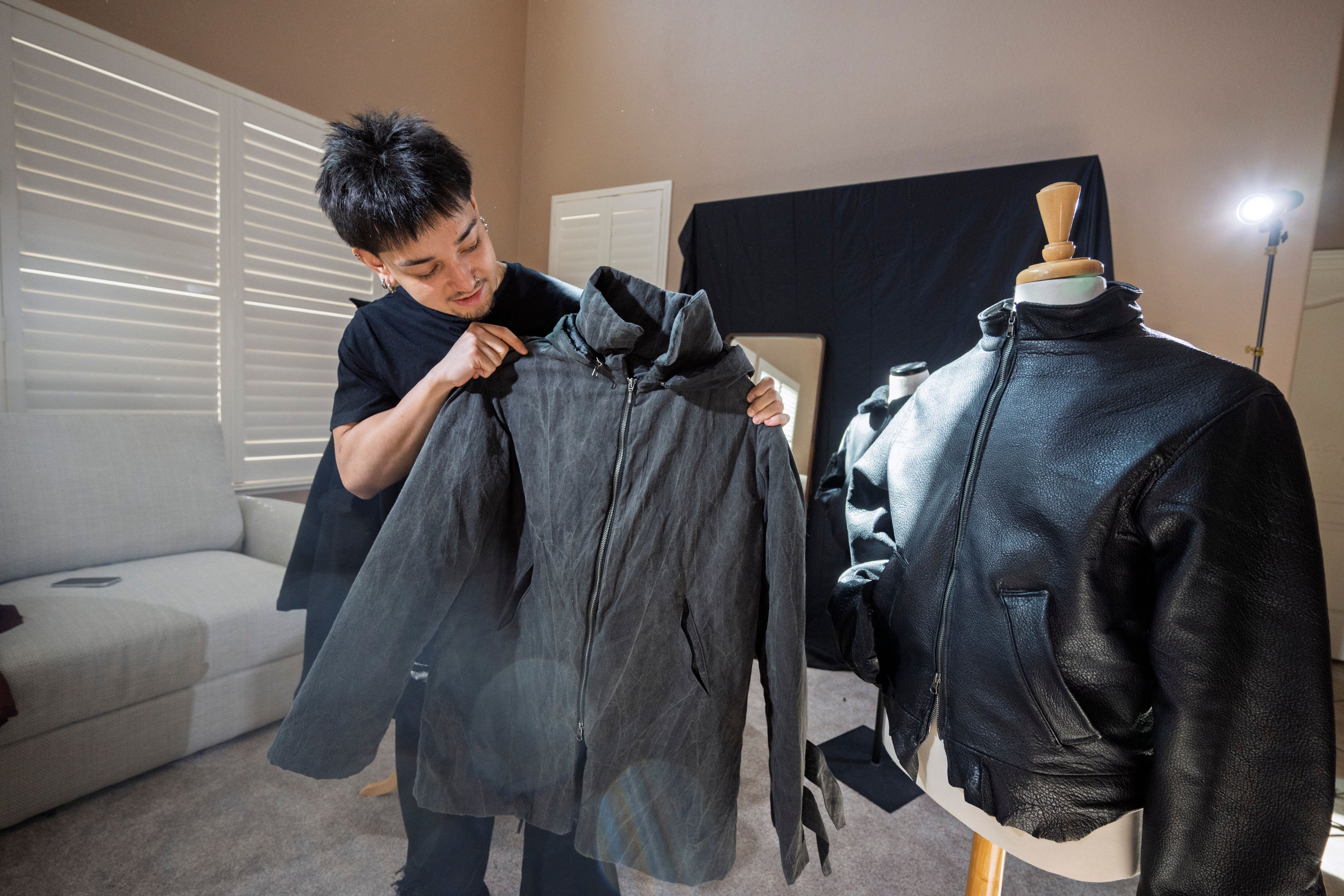 Jayden Cross sits for a portrait while showcasing some of his designs, some of which were featured in a runway show at LA Fashion Week in March.