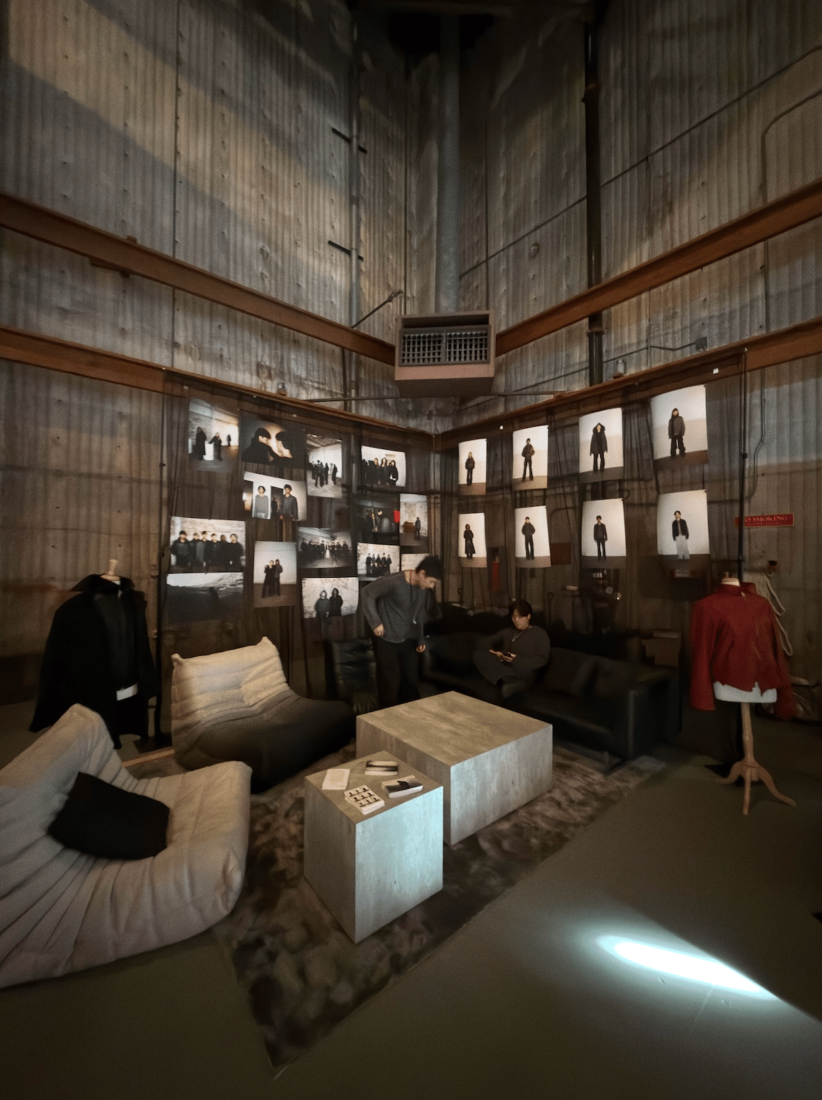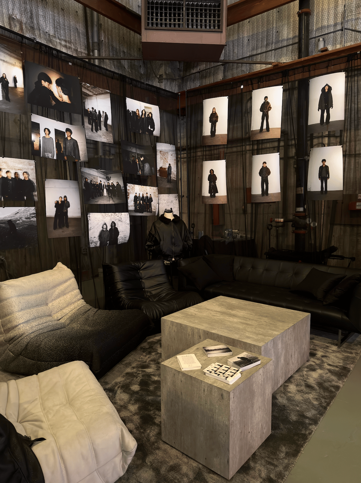 While the other booths featured a spartan setup with only tables, his “lounge” included comfy chairs, coffee tables and a rug, with portraits of his eight looks framing the space.