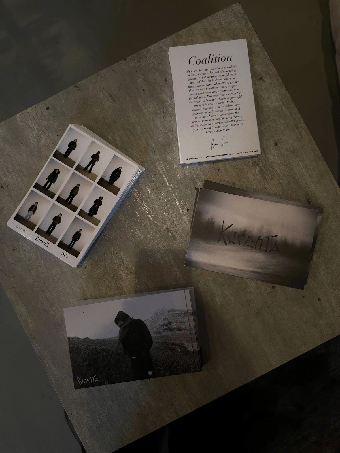 “It’s that dichotomy of luxury-looking pieces but also pieces have been aged, tattered, worn. Itʻs a like a mixture of motor culture, grunge, distressed, vintage — thatʻs the inspiration to the brand Kurento in general and the direction that I want for Coalition. Very heavy in leather, denim and distressing,” he said.