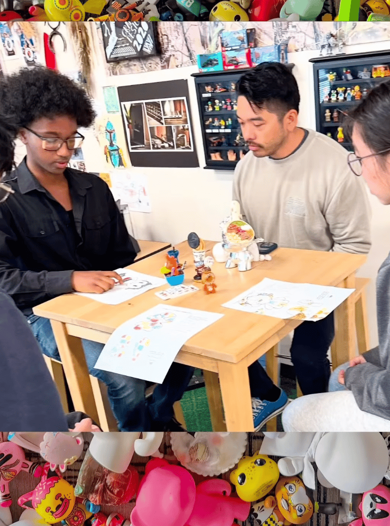 Designer toy artist Zard Apuya, right, works with graphic design students at Westview High School in Poway, California.