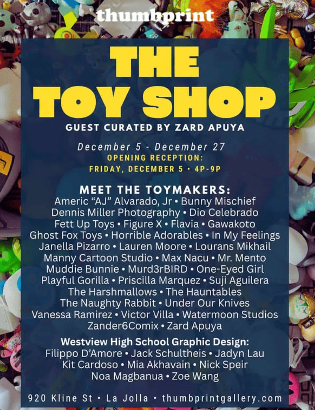 Fresh off DesignerCon in Las Vegas, Guam’s celebrated toy artist Zard Apuya is wrapping up a successful year of creative output with his latest collaboration with Thumbprint Gallery in San Diego: “The Toy Show,” which opens 4-9 pm today as part of First Friday La Jolla Art Walk.